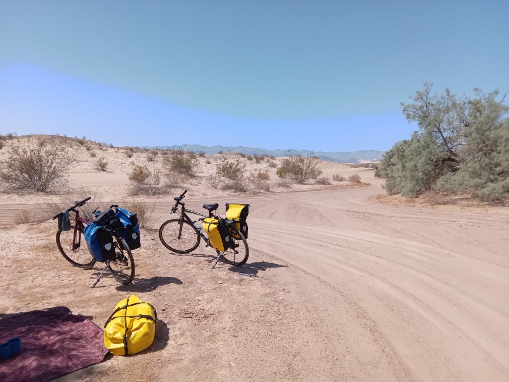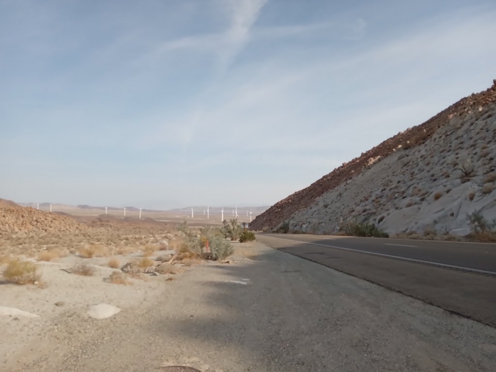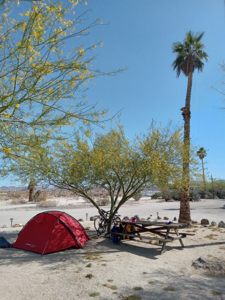 We soon got through the small town of Calexico and followed the very pleasant CA98 road all day, heading West with the mountains in Mexico away on our left hand side. Initially this was through very green farmland but we soon reached the final very hot, empty desert section of the ride. This turned out to be the perfect day of desert riding that we had been waiting for – beautiful scenery, a light breeze and relatively little traffic on acroad stretching out into the desert ahead. It was hot though, with the temperature well over 30C by late morning. We saw a fair few solar farms and wind turbines along the way – from our experience this place has plenty of the weather conditions needed for both! Struggling with the heat we were happy to reach the country’s most overpriced Chevron gas station for cold drinks just before we reached Ocotillo. Tonight we are camping at a fantastic RV park that is so welcoming to cyclists (Horspitality RV Park in Wickenburg AZ take note!) We have a fantastic campsite with access to an air-conditioned rec room, cooking facilities, a big fridge, laundry for $1 and (most importantly of all!) unlimited ice.