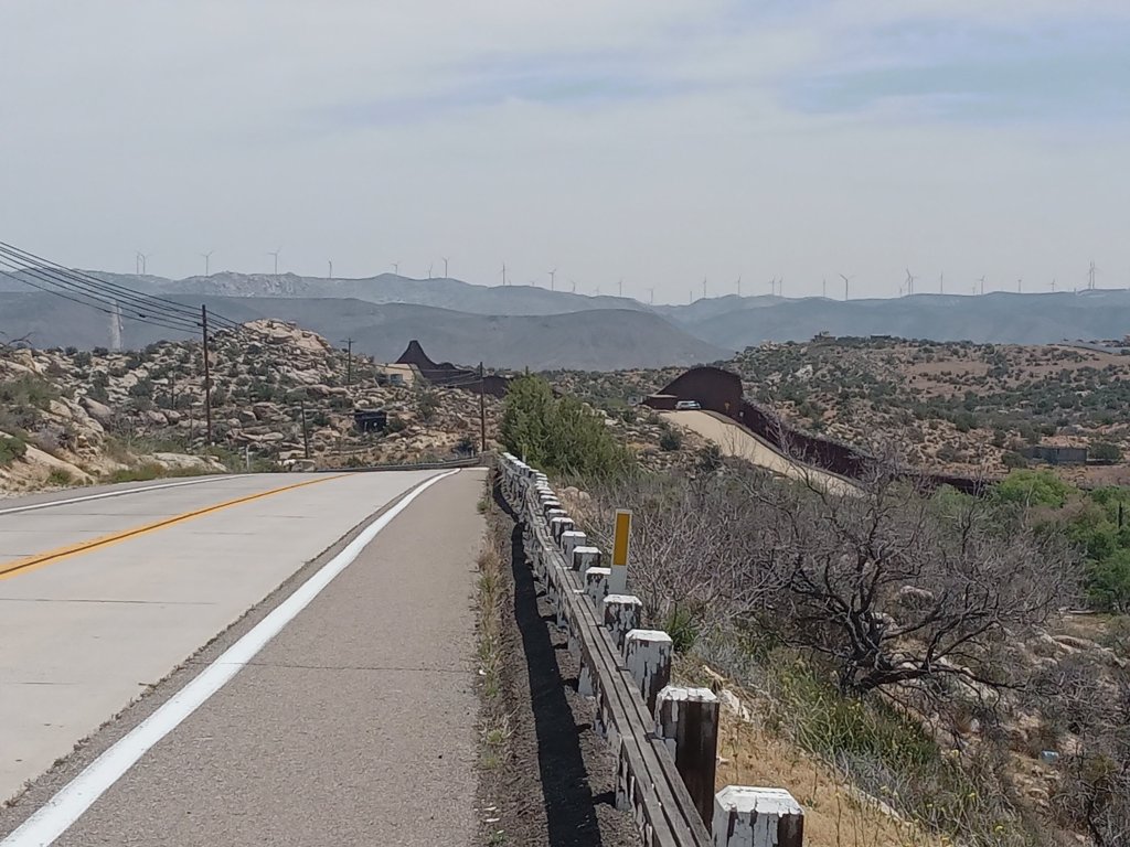 Today was relatively short but tough as we finally left the flat desert valley behind and began the ascent into the last mountain range that separates us from San Diego and the Pacific Ocean. The only road west from Ocotillo is Interstate 8, so we had no choice but to cycle yet again on on interstate shoulder. Ignoring the “no bicycles” sign at the on ramp (we’re still not 100% sure of the legality of cycling on interstates, but believe it is allowed if there is no other route available) we followed I8 for 20km uphill. The traffic was much lighter than the horrific I10 earlier in the trip, and the westbound and eastbound carriageways followed entirely separate routes through the mountains which at least served to reduce the traffic noise slightly. We passed two “cyclists must leave at the next exit” signs (given there was a sign saying that we weren’t allowed on in the first place, I struggle to understand the logic of this) before joining the lovely “Historic US80 route” into Jacumba CA. Jacumba a tiny town, but pleasant enough. It’s most dominant feature is the huge Mexican border fence towering behind it. I’m still wondering if this is the fence that Mr Trump and friends felt wasn’t big or tall enough, and exactly how high they felt the needed to make it – seriously, it is huge! Jacumba had a small shop run by a slightly harrassed looking guy who was trying to operate a sandwich making counter at one end and serve customers at a till at the other end. So many businesses that we have seen on this trip, from motels to shops, seem ridiculously understaffed with one person doing 2 or 3 people’s jobs that I can’t help but think allowing a few immigrants through that big fence and giving them gainful employment might benefit everyone. Anyway, we were happy to eventually get snacks and cold drinks to refresh ourselves before another couple of big hills. The road for the rest of the day was fantastic with little traffic and lovely scenery. Matbe we have spent too long in the desert, but we were disproportionately happy to be cycling through green fields and trees and an afternoon temperature only just over 20C. We have a good value motel for the night run by a slightly quirky guy. After a discussion about today being the anniversary of the Chernobyl disaster and much searching around for TV remote controls, he finally got us checked in and we are enjoying a beer on a pleasant, cool evening at last!