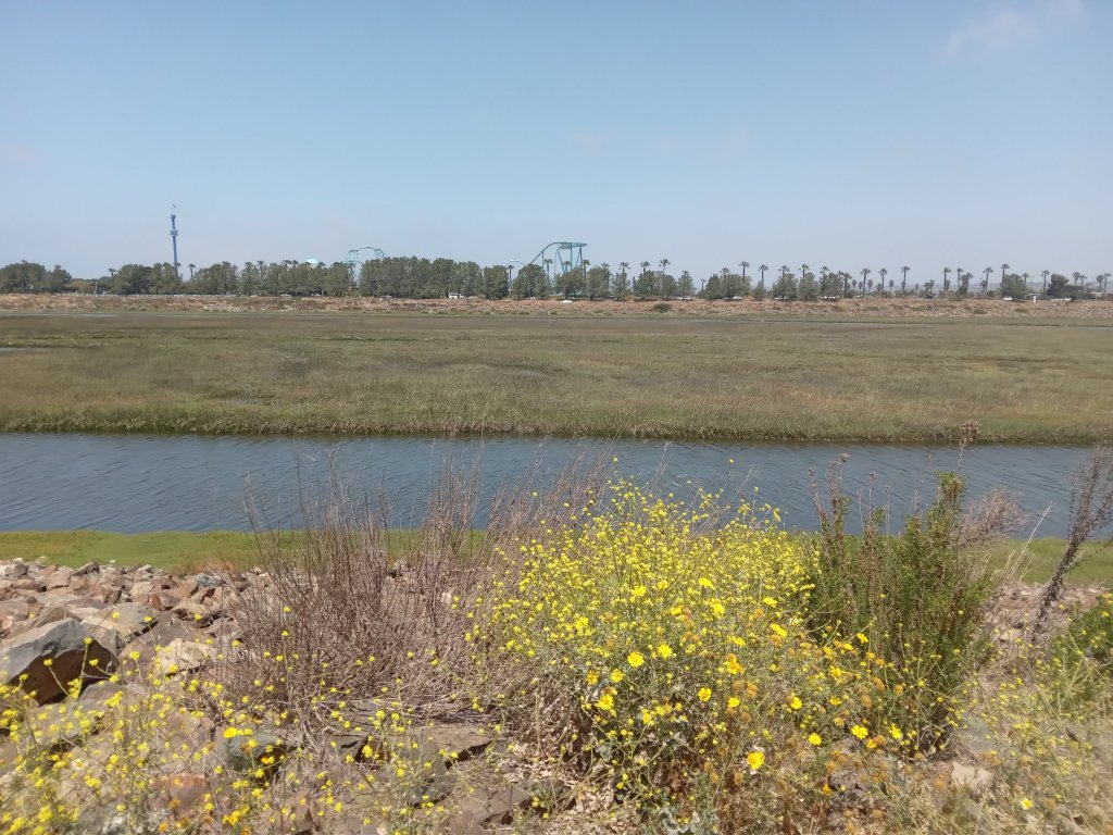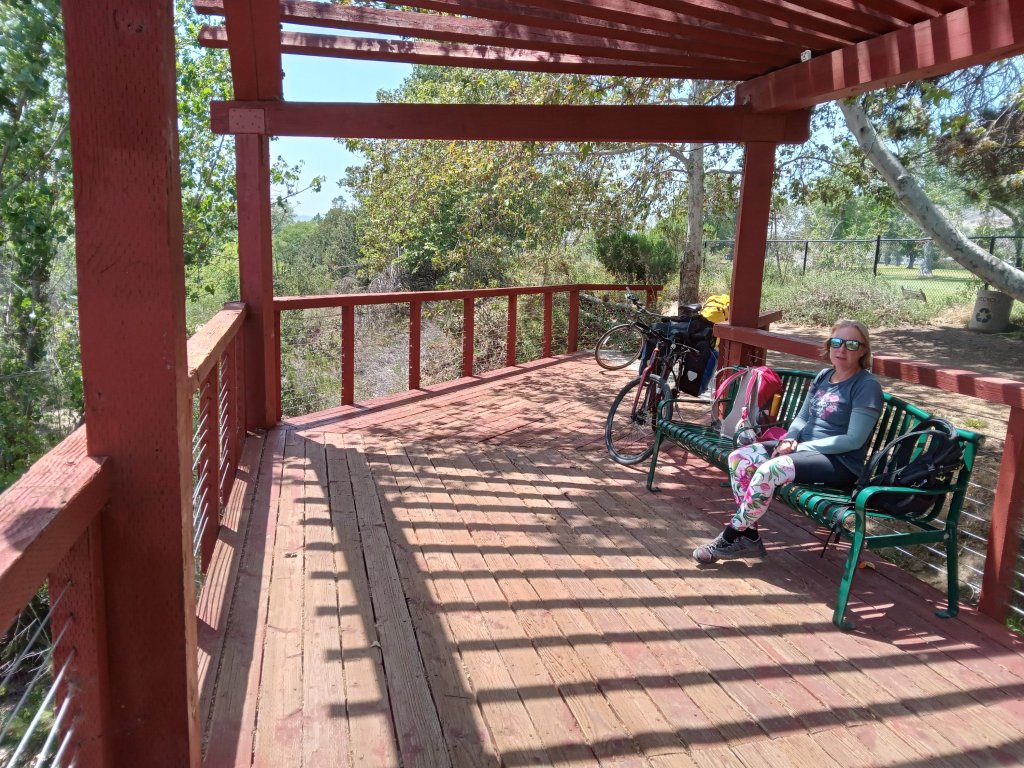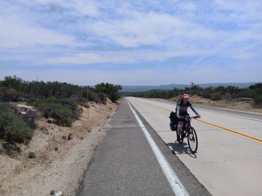 Our long awaited downhill day to the coast started (almost inevitably) with a 4km uphill, although for once the top wasn’t as high ot as far as the GPS elevation profile predicted (we were definitely due). The downhill then finally started in earnest. The scenery was lovely as the road dropped down out of the mountains towards the coast. The road gradually got busier, but had a good shoulder or cycle lane (in this context, a cycle lane is exactly the same as a shoulder but someone has gone to the trouble of putting up a sign that says “cycle lane” or even very occasionally painting a picture of a bike on the shoulder). We had one final 5km stint on I8 when the other roads finally ran out, but being downhill, at least it was over quickly. We left I8 to join a road running parallel into Alpine CA, but not before negotiating a nightmare set of roadworks where the road was being resurfaced. We soon arrived in Alpine and stopped for breakfast at a nice little cafe. Alpine is a pretty town, and looks like quite a touristy place. We continued downhill on increasingly busy roads, although they mostly had a reasonable cycle lane. It was not the most pleasant cycling (apart from the fact it was downhill) as the drivers were the most impatient lot that we have come across so far. We witnessed a couple of “road rage” incidents with one driver yelling at another at traffic lights – I thought Californians were supposed to be chilled and relaxed? We managed to join a traffic free multi-use trail for a few km towards the end of the day which took us very close to our motel for the night. Popping out for supplies, I witnessed one final “rage” incident of the day as a guy in a car had an absolute meltdown at another guy for not pushing his trolley across the pedestrian crossing in the Vons supermarket car park quick enough – what is it with people here? Maybe it’s a big city thing or a Friday afternoon thing, or maybe people here are just a bit crazy – who knows?