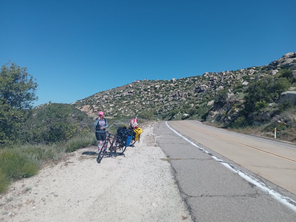 A nice day’s cycling today along Historic US80. Interstate 8 runs parallel a few km away, so the road was almost entirely traffic free. The scenery was beautiful with rocky mountains, green fields and trees and a wonderful change after so long in the desert. The road was hilly though and tough on the legs after yesterday’s big hill climb. There was a long ascent out of Boulevard followed by a great descent through lovely scenery. We had a coffee break at the bottom to fortify ourselves for the 2nd big ascent which was even steeper.The GPS elevation profile got this one totally wrong and it was longer and higher than we were expecting which is always a touch demoralising. We passed through a border control checkpoint where the guy on duty told me I was “nearly there” – I’m not sure where “there” was – I assumed he meant the top of the hill, but if it was then he was unduly optomistic. We eventually reached the top and crossed I8 before a nice final 3km down into the town of Pine Valley. When we were back in the desert in Ocotillo a few days ago and made a reservation at the motel in town, I pictured a verdant green valley, with huge pine tŕees surrounded by mountains, and it didn’t dissapoint – it really is a beautiful little place. The guy running the motel was very friendly and we like the place so much (and need a bit of a rest) that we have decided to stay an extra night before the final push into San Diego.