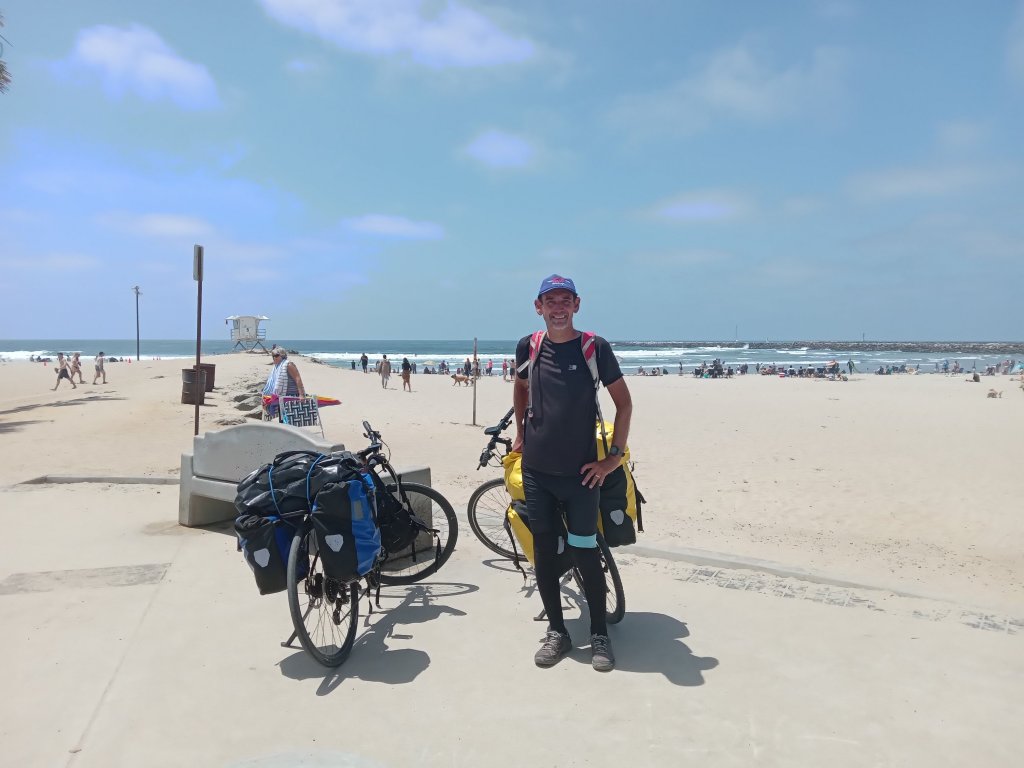 The final day of the ride! Leaving the motel, we started off negotiating some busy roads, but the traffic was much lighter than yesterday and even the drivers seemed to have got over their Friday afternoon insanity. The Southern Tier route map did a pretty good job of steering us via the least scary roads and there were generally good cycle lanes – we even saw plenty of other cyclists out and about for once. There were still a few uphills that we weren’t expecting though. Progress was pretty slow as it always is in the city. The route twisted and turned a lot – right turns were OK, but every left turn was impossible to cross 3 lanes of traffic to get into the left turn lane so we ended up getting off and pushing over 2 pedestrian crossings to get to where we needed to be – this may explain why 35km took us the better part of 5 hours today! There were a few really nice traffic free sections though and the last 7 or 8km was on a nice cycle path with the San Diego River estuary on our right and (unfortunately) our old nemesis Interstate 8 on our left, slightly spoiling the ambiance. The cycle path ended at the beach and the Pacific Ocean – we’ve made it! We just about had the energy for a couple of end of trip photos with the beach and ocean in the background. We don’t go in for this strange practice that most cycle tourists seem to have of dipping various parts of their bike and/or themselves into the water upon reaching the coast, so went and checked into our motel that in a masterpiece of planning (for once) was just a few hundred metres away from the end of the route. The Ocean Villa Motel is a lovely little place in a great location, right on the beach. It’s costing us a budget-busting $400 for 3 nights, but given the location right on the beach and the fact that it is on a busy weekend, that is actually pretty good value. We’ve got 2 full days here to hopefully explore a little of San Diego before starting the long journey back to the UK.