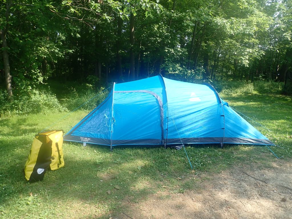 Our ride got underway through some slightly dicey looking areas of western Buffalo. As time went on things became much more suburban and affluent. When we stopped outside a diner to eat a peanut butter sandwich, the owner invited us in and gave us a free breakfast – maybe a sign of how exhausted we looked 20km into the trip? Later we joined NY route 5 which would take us along the shore of Lake Erie for the next few days and made our way to Evangola State Park – our most expensive camping of the trip since they insisted on us paying for a 2 night minimum even though we were only staying for 1 night and then charged us an extra $10 for not being NY residents – thankfully the only time we came across this scam in the many state parks that we camped in!