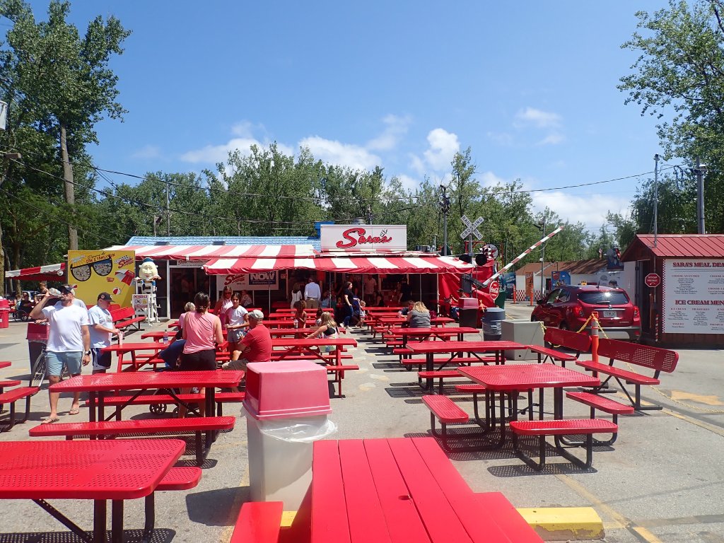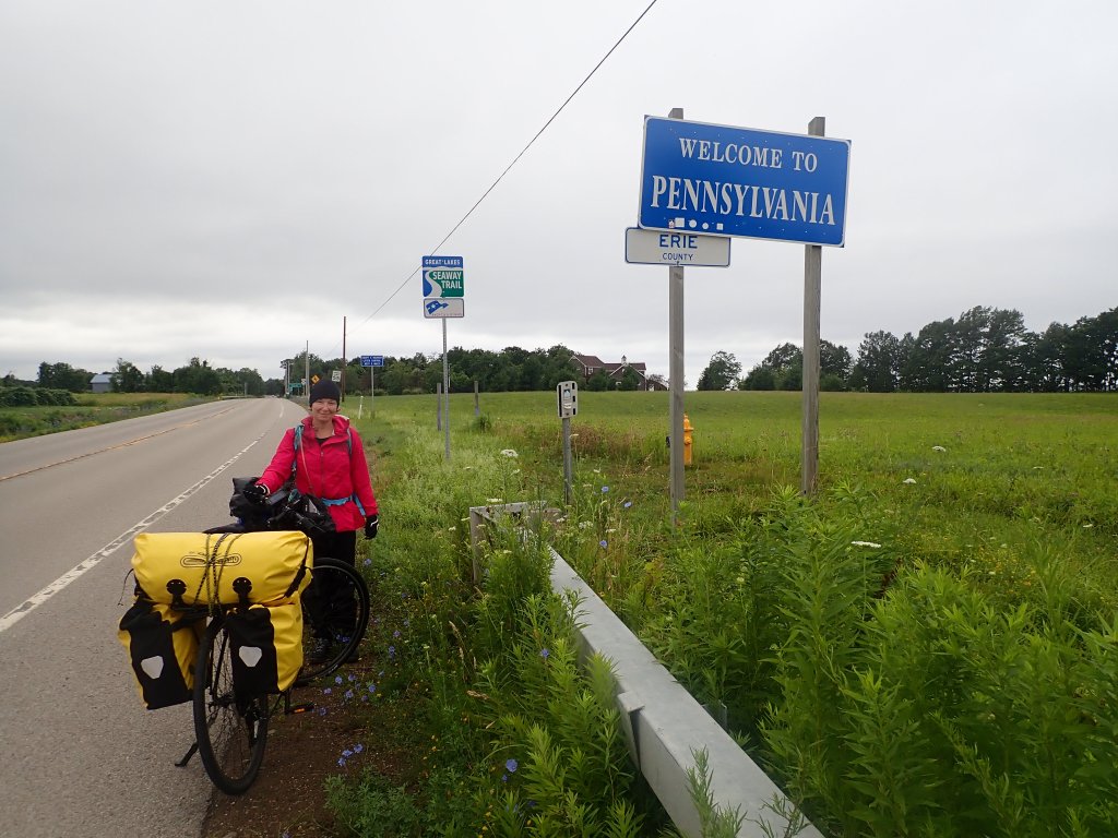 More of the same scenery and weather today. We crossed our first state line from NY into PA and took the first of what would become our traditional state line crossing photos. Despite the weather, a motel in Erie was well beyond our budget but today our luck was in and the sun came out as we arrived. On arriving at the campground we were told that it was full but just as we were about to leave they found the last free pitch on the site for us at just $15 dollars per night so decided to have an extra day here. The amazing burgers and hot dogs at the on-site diner may also have played a part in this decision.