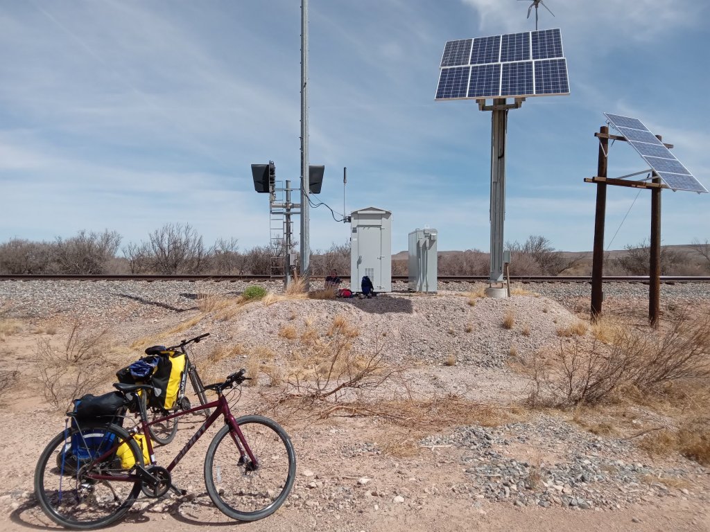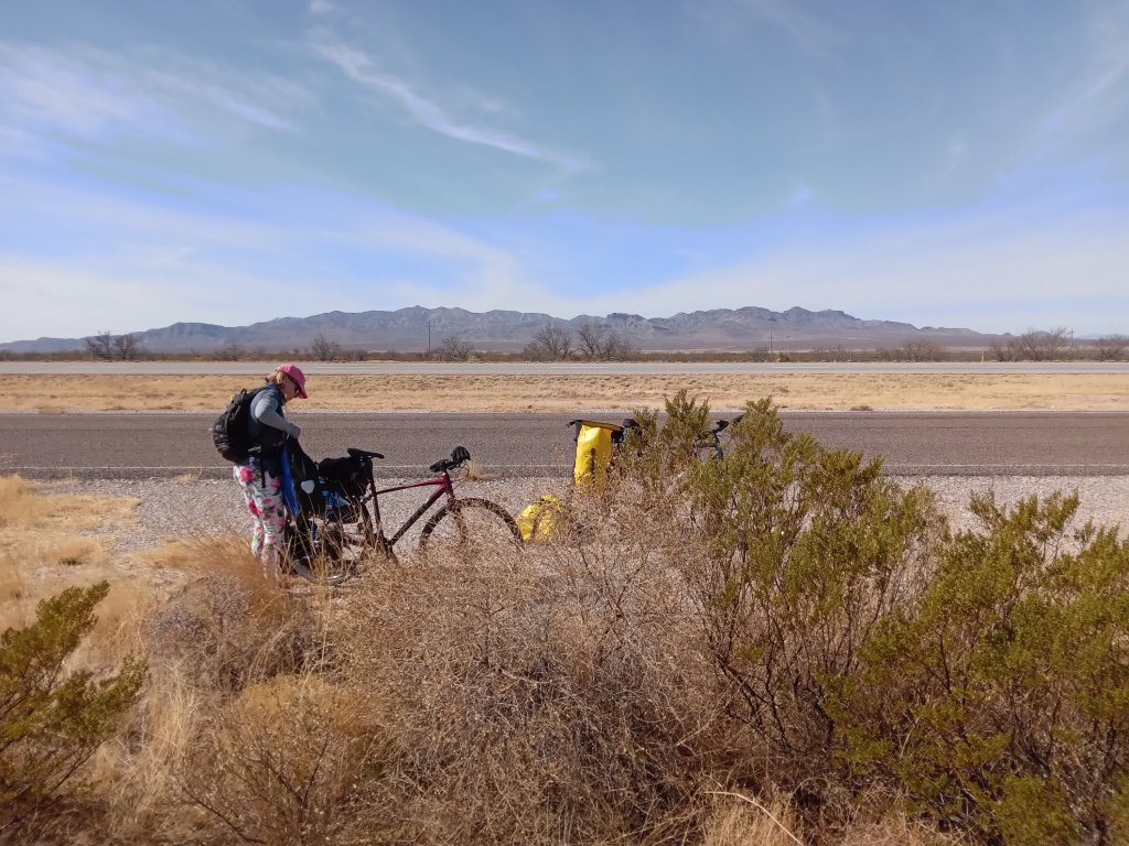 Today we headed West along interstate 10 – most of the route was on a service road along the side but for 10km or so out of Van Horn it was on the road shoulder – this felt like taking a bike ride along the hard shoulder of the M1 in the UK, but apparently it is legal here if there is no reasonable alternative route. The weather today turned out to be gloriously hot and sunny with light winds whch made for the easiest cycling day for a while. We arrived early in Sierra Blanca, just before 1pm, although this was helped by unexpectedly crossing into the Mountain Time zone! We passed a group of 13 other cyclists today heading east on the Adventure Cycling Association’s vehicle supported trip (we later learned that people pay $7000 per head for this service!) Two of them stopped for a chat and gave us some trail mix and a spare sandwich which was nice! Arriving early meant that we had plenty of time to relax at the motel and enjoy being in an actual bed for the first time in over a week – an experience that was slightly spoiled by the bed bugs that we shared the place with!