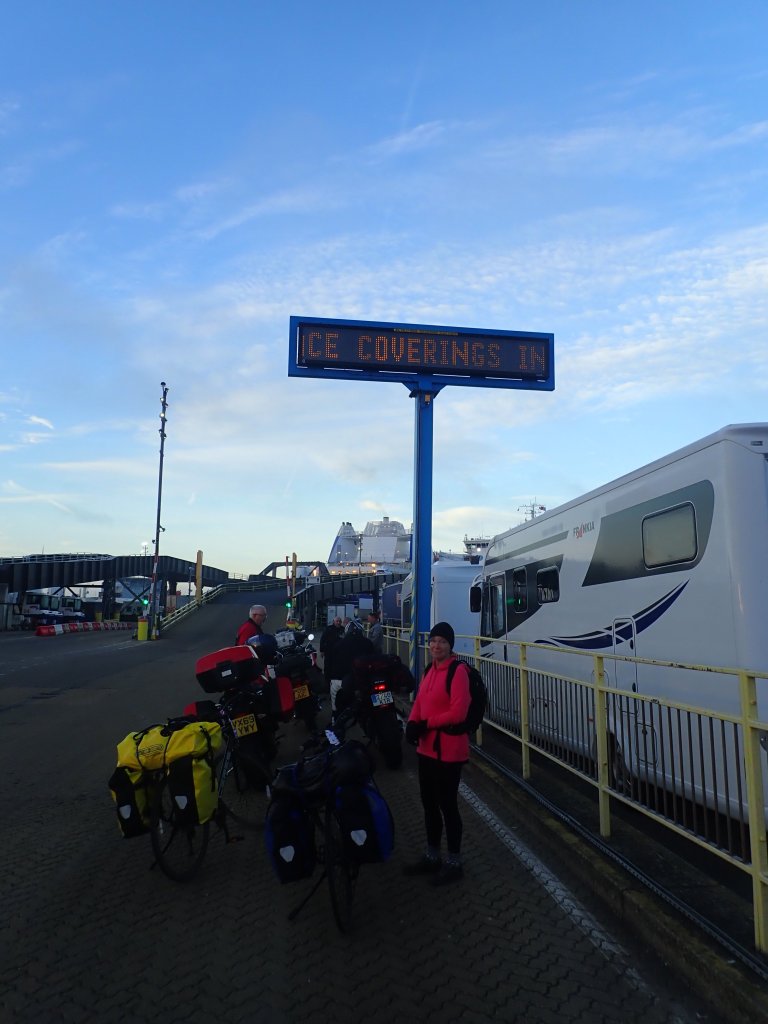 It was barely light on when we left the hotel for the short ride to the Portsmouth Ferry Terminal which we rode on the pavement having neglected to fit our bikes with lights – hopefully this would be the only day on the trip where that would be an issue. Arriving at the terminal, we were directed to join the queueing cars which is never fun on a bike, sitting just behind someone’s exhaust pipe. It seemed to take forever to get to the checkin booth – in the old days presumably people had to show a paper ticket and a passport and they were through, now everyone was struggling with their phones to find digital tickets, Covid tests and vaccination certificates! We finally got to the booth and rather nervously handed over our US vaccination cards which look horribly inadequate compared to those from the UK with scannable QR codes. We were relieved that they had no problem with them, and because we were vaccinated they didn’t even want the negative test – £300, a cloned credit card and a night in Southampton for nothing – wonderful! We got directed to the front of the queue with a couple of other cyclists and a fair few motorbikes but still had to stand around for over an hour on a freezing cold morning before boarding. Cyclists definitely get a raw deal here – foot passengers sit in the nice warm terminal building, drivers sit in their nice warm cars, we were freezing waiting for the signal to board. When they finally decided to board 2-wheeled vehicles, they sent the motorbikes along a nice flat ramp to the lower car deck and us up the steep slippery metal ramp to the upper deck – thanks Brittany Ferries! The guy directed us to put our bikes next to some metal anchor points and picked up a length of rope looking like he was going to secure them, before apparently deciding that it was a bit much effort, so we tied them up ourselves. After struggling up lots of stairs with our panniers, we eventually negotiated a maze of corridors full of cabins with the most illogical numbering system imaginable to find our home for the night. I have to say that Brittany Ferries “Galicia” was wonderful. Being October in the middle of the Covid pandemic, it was also virtually empty. There were a couple of decks with lovely seating areas and a bar serving great coffee and snacks at a reasonable price – all we needed to while away the day. Our ticket price also included a 3 course dinner with full waiter service (which being a French company was amazing). €5 got us a caraffe of great wine to go with it. Slightly sad to say that this was the best meal out that we had had for years – the same meal on dry land in the UK would probably have left us with not much change out of £100 I suspect. Well satisfied with dinner, we retired to our comfy cabin for the night – the first time we were on a cross channel ferry we slept on the floor under the stairs, so we are definitely going up in the world slowly but surely!