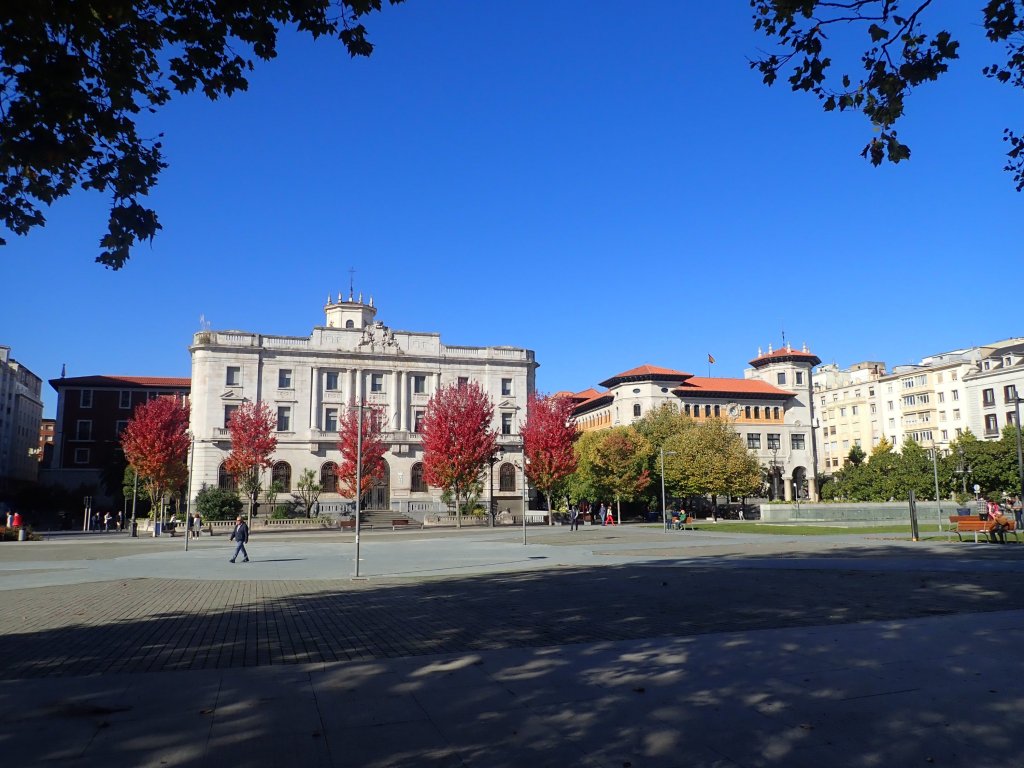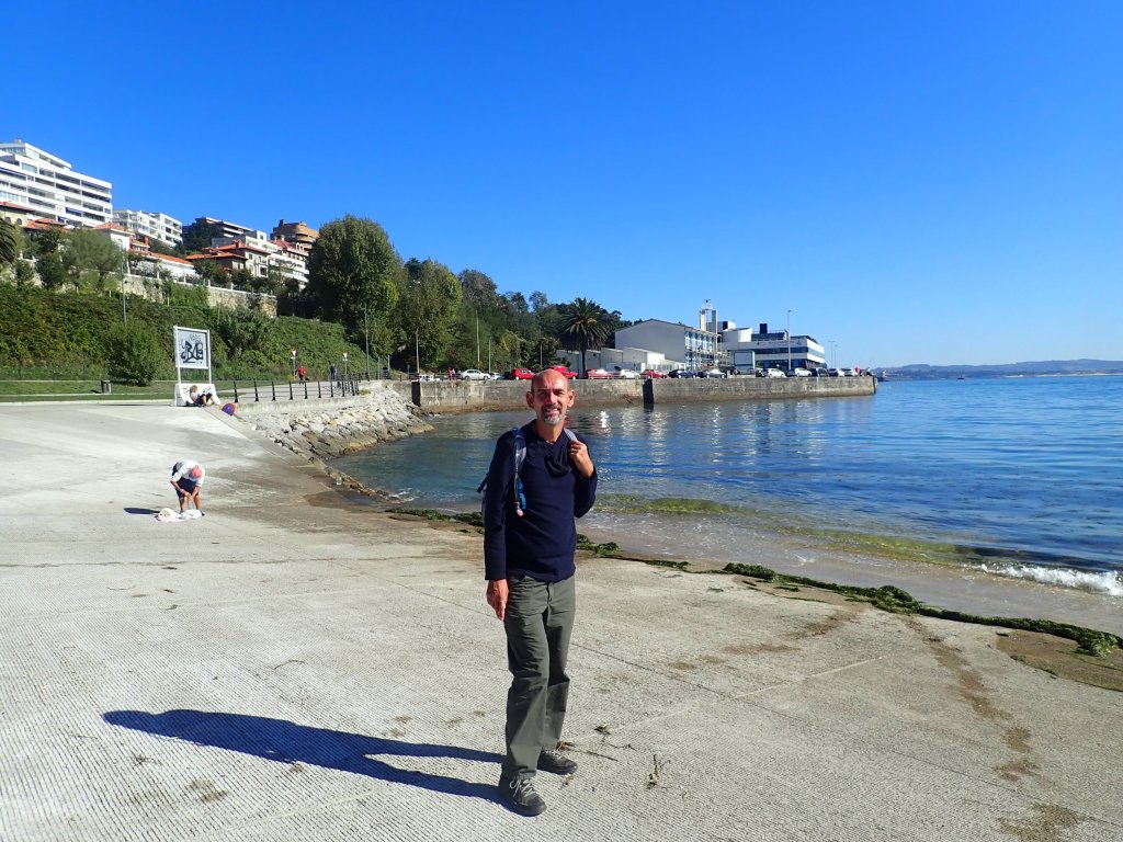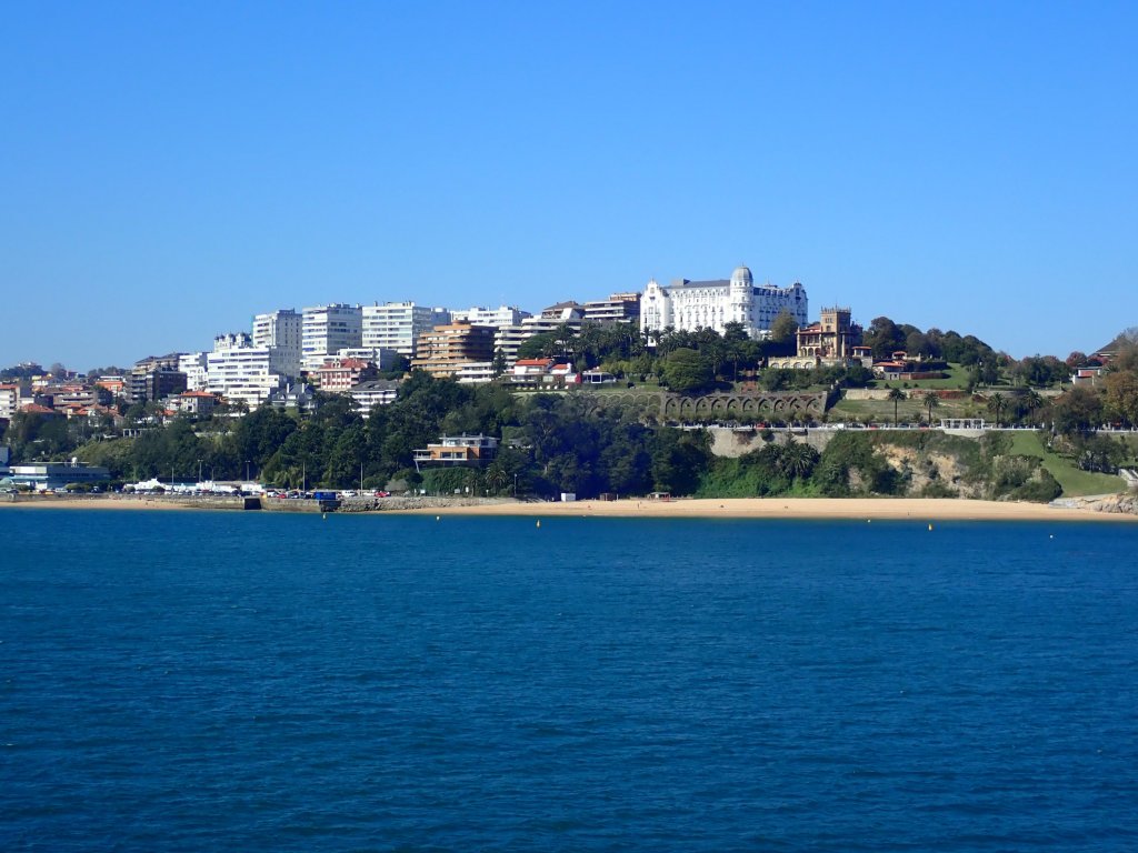 We woke up to a glorious sunny morning with blue skies, a few fuffy clouds in the sky and a lovely blue sea all around – we’d been extremely lucky with the October weather in the UK, but we could tell that we had travelled south as this looked more like summer (albeit with a gale force wind blowing across the Bay of Biscay). Our ticket included a great breakfast buffet which we took full advantage of before whiling away a few hours waiting to finally reach Spain. We went up on deck to see beautiful views of Santander as the ferry came in to dock before taking our bags back down to the car deck and loading up the bikes. We may have been slightly over-enthusiastic about doing this as we had to wait for what seemed like hours for the ramp to be lowered and all of the cars to drive off before we could finally cycle off into Spain. We followed a long looping road through the port, through a very cursory passport check (and the new experience of getting our passports stamped going into an EU country – yet another “benefit” of Brexit!) before rather alarmingly ending up on a road signposted as the exit to the autoroute. Not sure what to do, we spotted a small exit gate with a barrier across it that seemed to be for staff only and pushed our bikes through into the streets of Santander. In the process we seemed to circumnavigate Spanish customs, but nobody seemed to care (presumably there is a limited amount of contraband that can be smuggled in bicycle panniers). We then followed some great cycle lanes along the coast around the headland (way better than any we had seen in the UK – Sustrans should come and see how it should be done!) with fantastic views of the town, rocky headlands and beaches to reach the hotel that we had booked for the night. The 4* Hotel Hoyuela looked a little grander than most places that we stay in, but the receptionist was happy for us to wheel our bikes through the foyer and put them safely in a storage room for the night.