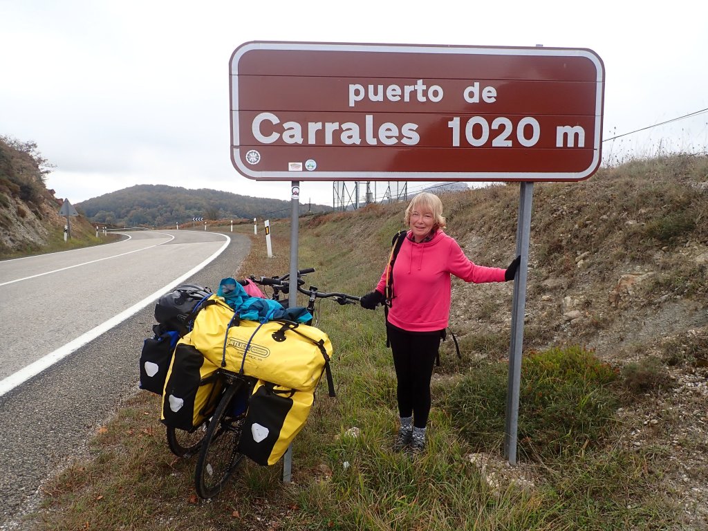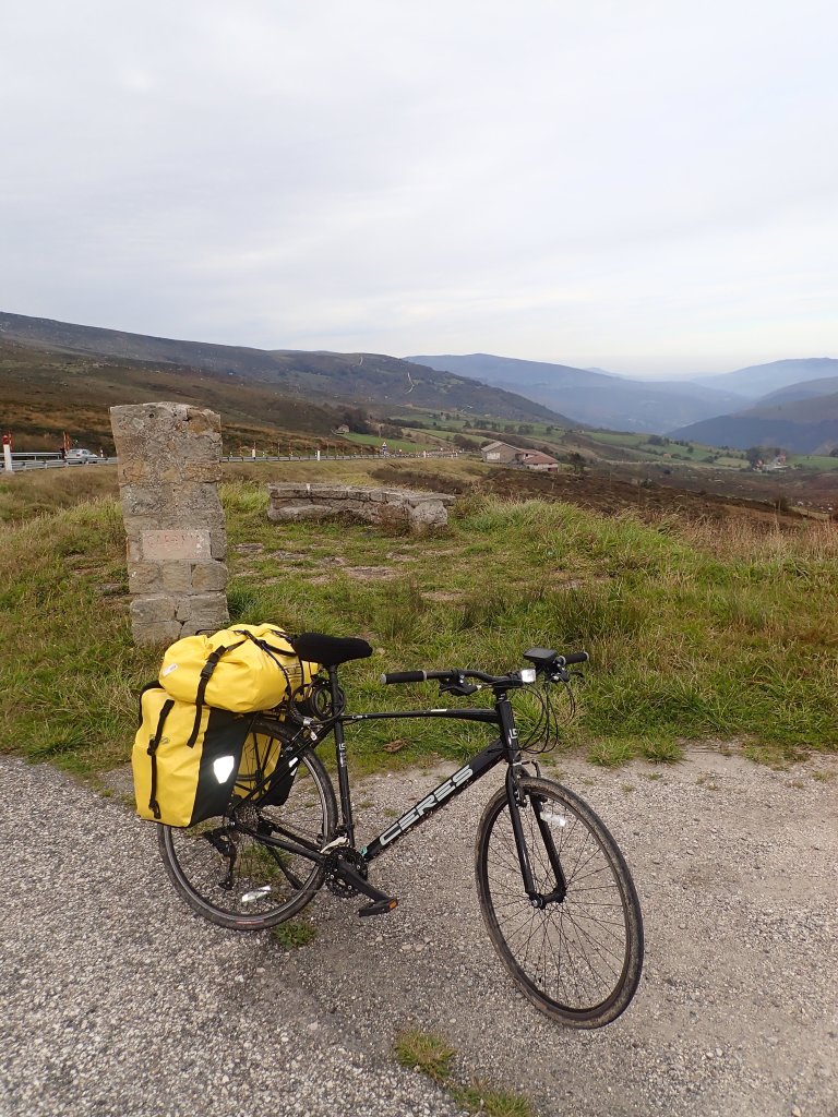 We followed a quiet road out of town, and following the directions from the hostal owner soon joined up with the traffic free cycle route “Vias verdes del Pas” which was a lovely route, busy with walkers and cyclists on a Saturday morning. It gave us some very enjoyable cycling with only the gentlest of uphill gradients, for 20km or so along the Rio Pas valley, before eventually running out and forcing us the join the N623 main road. Traffic on the main road was light and we continued through some lovely scenery. At this point, we noticed that we were the better part of two thirds of the way through a 50km day that we knew had over 1000m of height gain and had so far managed to gain approximately 100m – every km that went by relatively flat was something of a mixed blessing – when the hill did come, it was going to be seriously steep! The road didn’t dissapoint, and soon we were climbing very steeply up into the mountains. We managed to ride most of it, but when we got sight of the road winding up to the mountain pass, it became clear that there would be some pushing involved! We finally struggled up to Puerto de El Escudo, at 1011m the highest point we had ever ridden (mostly) our bikes to! – and took a much needed rest and what would become our tradition of a photo next to the sign. The road then went downhill for a disappointingly short distance before levelling out for the last few km. The landscape here was very bleak and empty and with the map showing a couple of km to go, we were starting to get a little concerned that this may be one of those occasions where Booking.com had a hotel in the wrong location! We were very relieved to see the hotel come into view around a bend in the road, and it really was a beautiful cute little place. There was nothing else around, so we pressed our newly purchased kettle into service and had pot noodles for dinner (and a bottle of cheap wine from the bar!). The room had stone walls, a radiator that came on for the briefest of times at was nearly 1000m above sea level in the mountains in mid-October. Also, hotels in Spain seem to be yet to discover the benefits of duvets as bedding – a couple of thin blankets was all that we had – It was a very cold night! It was at this point that we decided that we would expand our collection of small electrical appliances that we were now carrying to include a small heater at the next available opportunity!