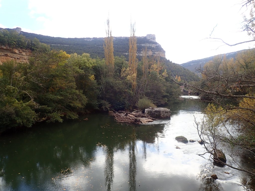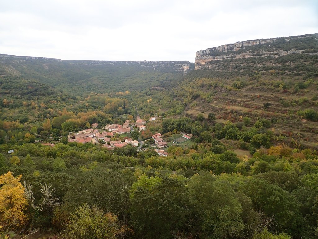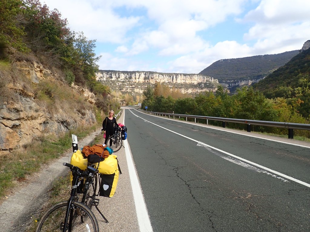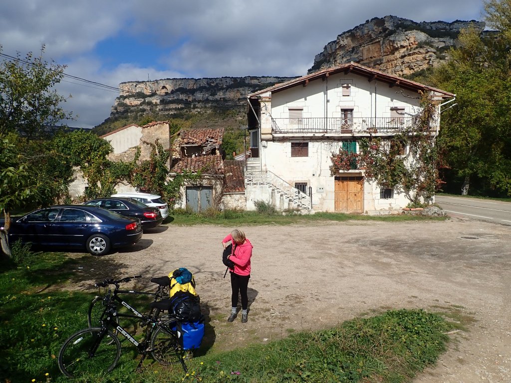 The first half of the day stayed fairly high in the mountains, but was relatively flat with only gentle ups and downs compared to yesterday’s long ascent. Half way through the day, there was a big change in the scenery as we started a long descent into the Ebro valley with amazing views of the towns and villages below and spectacular limestone cliffs along the river gorge. At the bottom we stopped in a little restaurant and in a step up from our usual bread, ham and cheese for lunch treated ourselves to hamburger and chips – in part beacause “hamburguesa” was the only thing on the menu that we were 100% sure about what we would get! The road then continued through lovely scenery along the flat Ebro valley to today’s accomodation in the small village of Covanera. We had booked a lovely little place, but arrived to find everything locked up and a phone number pinned to the door – always our worst type of check in given our non-existant Spanish language skills. Phoning the owner, she spoke no English, but after a brief conversation that basically involved just the words “Hola”, “reservation”, “booking.com” and “check in” (our Spanish is getting better!) we were relieved to see a lady emerge from the house opposite who let us in and explained lots of things that we didn’t understand – we just said “Si” to everything and it all seemed to go smoothly enough. The only other business in the village was a small bar opposite the hotel and it was a sunny afternoon, so there was a certain inevitability about what happened next. We were desperately low on cash by now and nowhere seemed to accept card payment, so much scrabbling around in pockets turned up a few euro coins. We had been lulled into a false sense of security in the UK where every business now seemed to expect contactless payment – some wouldn’t even accept cash, presumably a Covid thing. We probably looked a little desperate using Google Translate to search “How much is a bottle of white wine” (“cuanto cuesta una botella de vino blanco” for future reference!) but fortunately it was ridiculously cheap and our few euro coins was more than enough. We finished the day watching a lovely sunset on the cliffs, sat outside the bar enjoying a glass of wine before going back to the room to make up the pot noodles that we had with us – we know how to live!