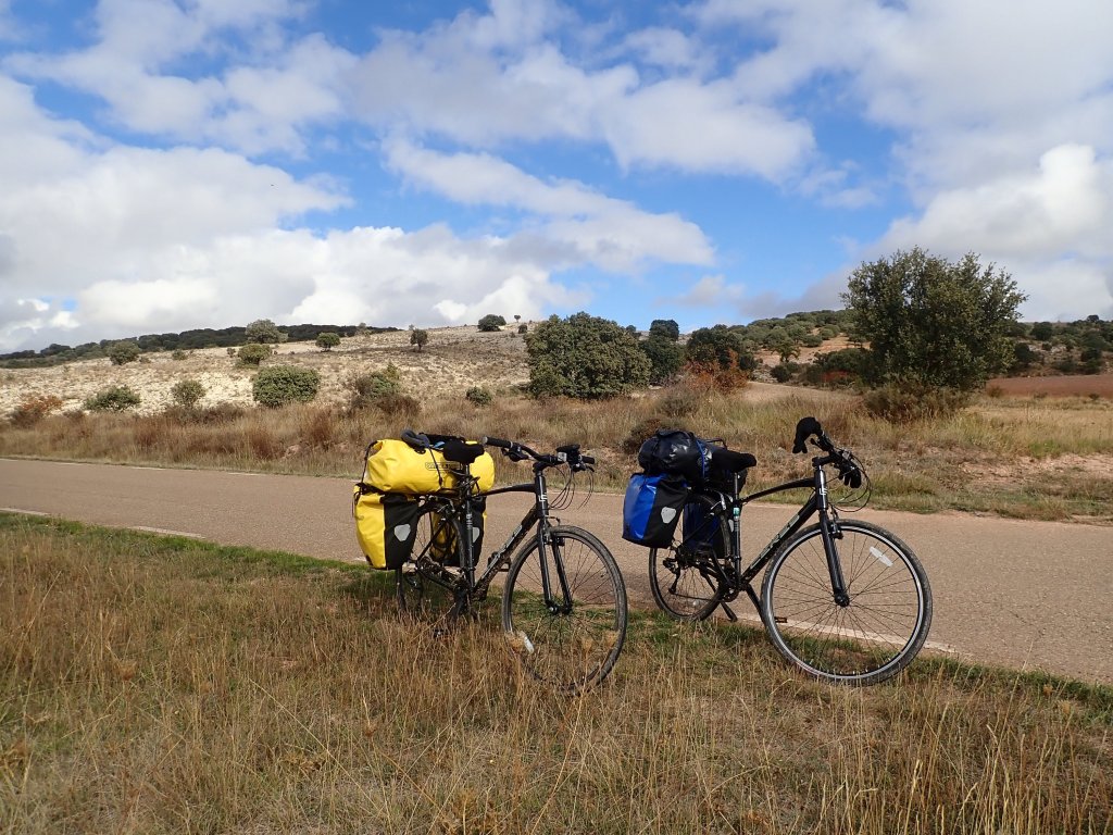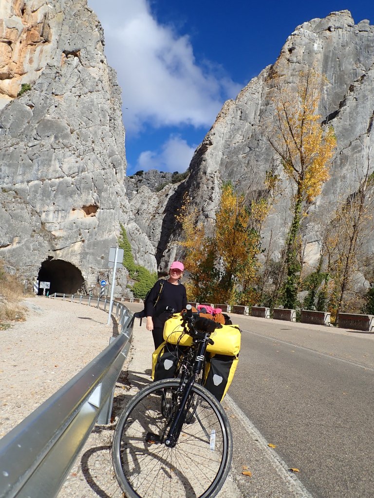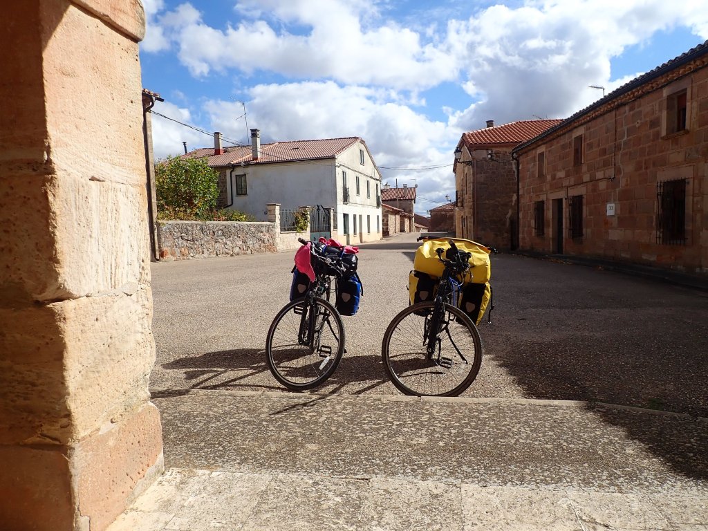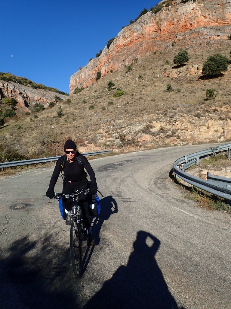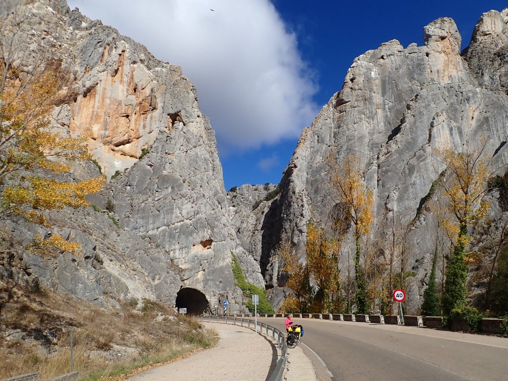The area around Hortiguela is well known as the home of several filming locations for the movie “The Good, The Bad and the Ugly”. There was a rough, steep, twisting unsurfaced road that went over a mountain to the village of Santo Domingo de Silos, passing one of the most iconic of these locations “Sad Hill Cemetry”. One of us (no comment on who!) thought for a while that this would be totally worth it on loaded touring bikes for the chance of a photo opportunity next to the life size Clint Eastwood cut out. Luckily, sanity prevailed and we chose to give it a miss and go around the mountain instead. It was a freezing cold morning as we followed the road to Covarrubias. The sky was blue but the steep-sided valley was in shade and the grass still covered in frost. The scenery was wonderful and the hills manageable on a good road surface with little traffic. After Santo Domingo de Silos, the road went more steeply uphill and the mountains around towered over the road which eventually, with nowhere else to go, rather unexpectedly dissapeared into a tunnel. Emerging from the (mercifully short and traffic free) tunnel into a limestone gorge, the view was amazing. The landscape started to flatten out after this for most of the rest of the day, but we still had a long tiring uphill at the end of one of our longest days so far into Huerta De Rey and our hostal for the night.