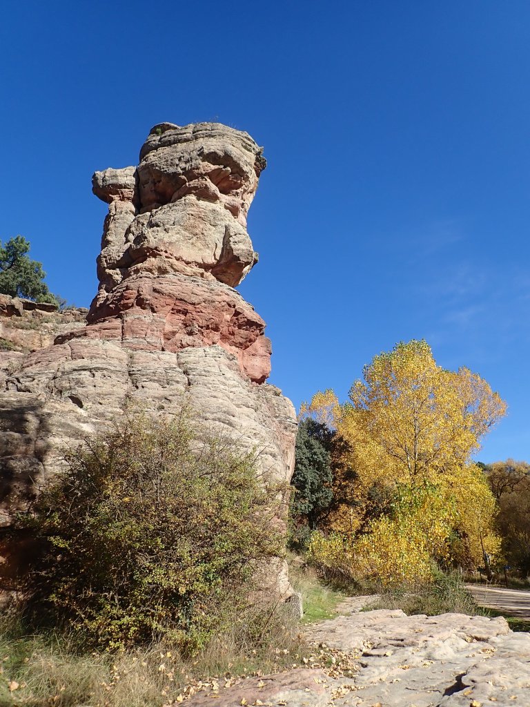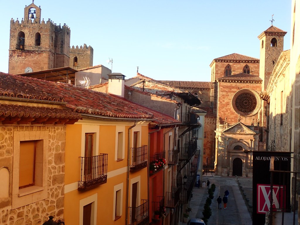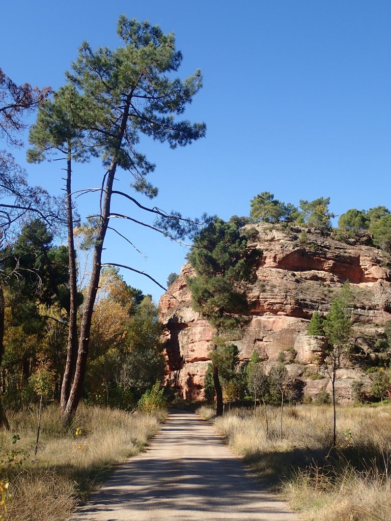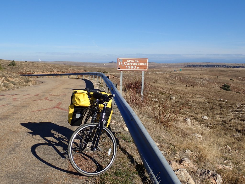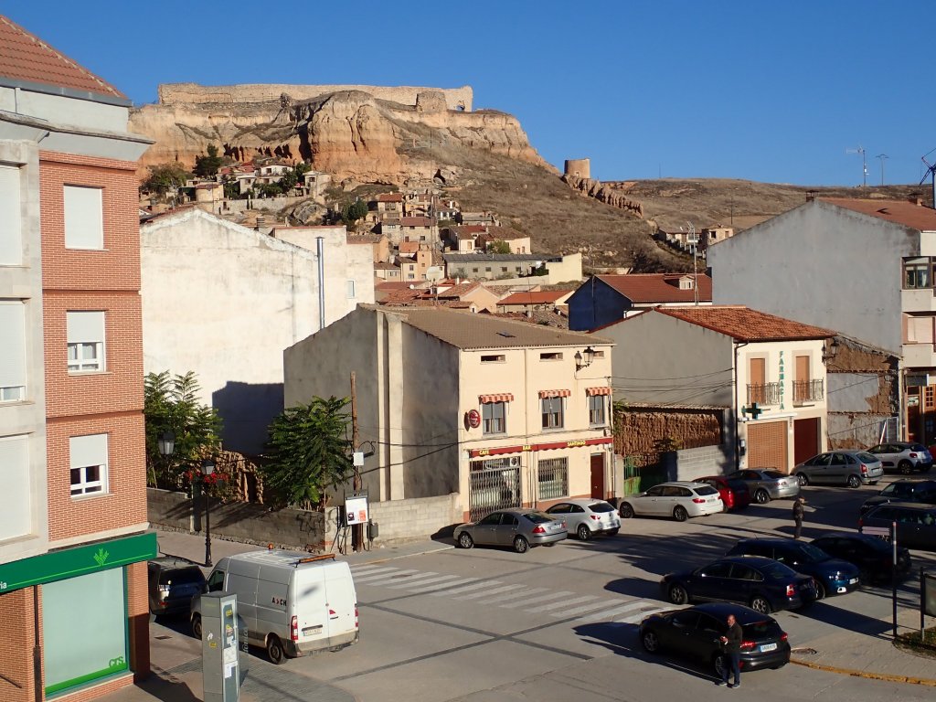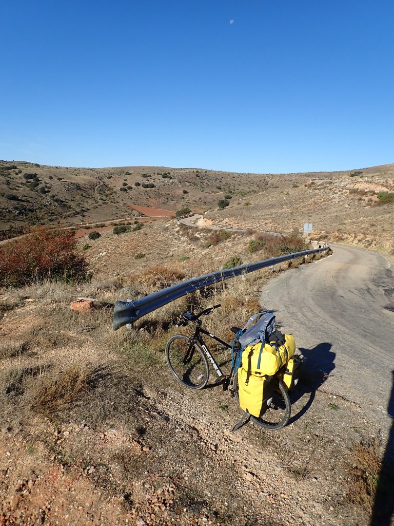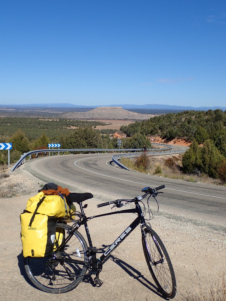 We had a shorter, flatter day today across a high plateau rather than up and down hills. The scenery wasn’t as spectacular as yesterday, but at least the riding was easier! We headed south out of Huerta De Rey along a flattish valley, in many places lined with vineyards which were spectacular in their autumn colours. The secondary roads that we were following took a very circuitous route to where we were going so we decided to take an unsurfaced road from the village of Hinojar del Rey to cut a fair distance off the day. These roads seem to be a bit hit and miss in terms of quality and much peering at Google Street View failed to give a clear outcome – the street view car gave up after the village, probably not a good sign! The road was actually a decent gravel surface and made for a nice traffic free ride before joining another quiet secondary road into town at the end of the day. Tonight’s accomodation was a proper modern hotel, not as “authentic” as the hostal rooms that we had been staying in, but at least it had heating! After eventually figuring out how to use our keycard to open the gate to the car park at the back, we locked our bikes up in the corner and went out for a couple of drinks at a small bar just down the road.