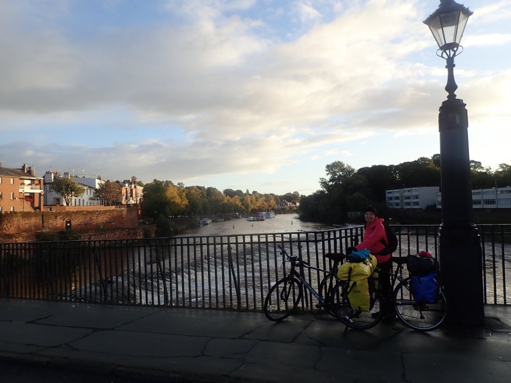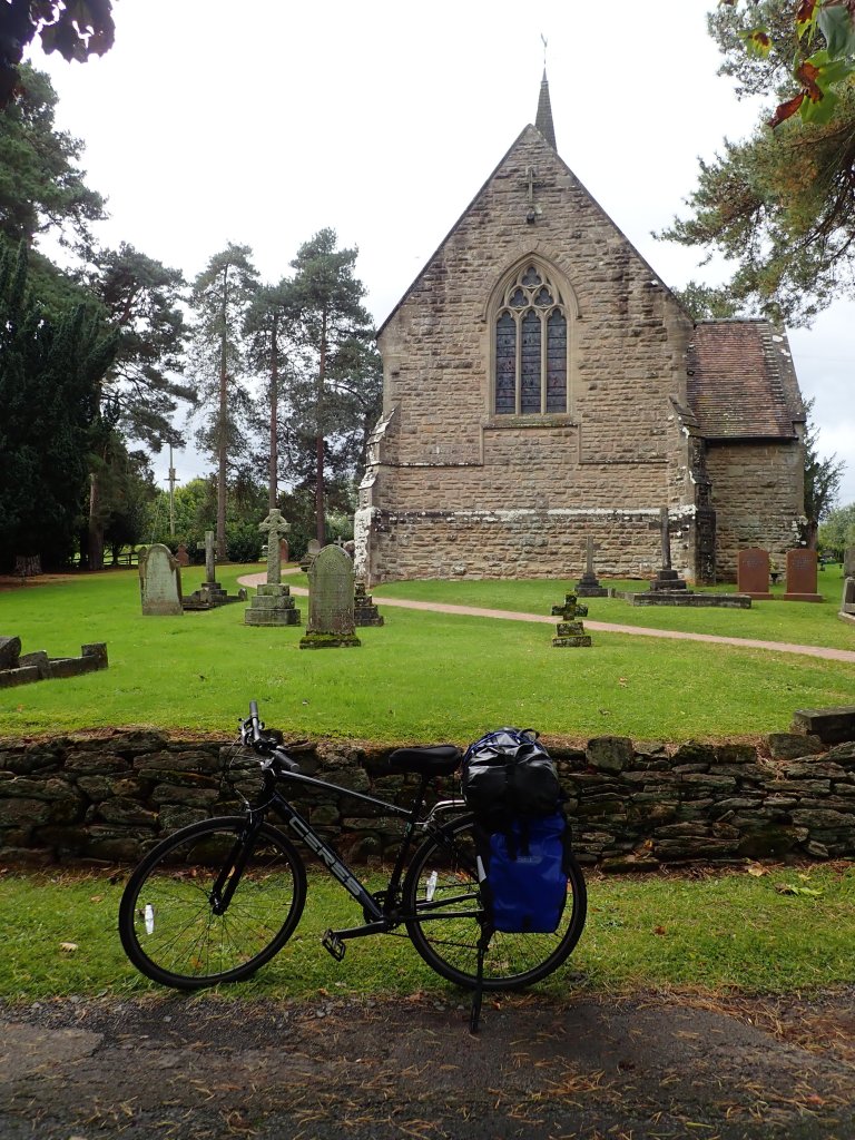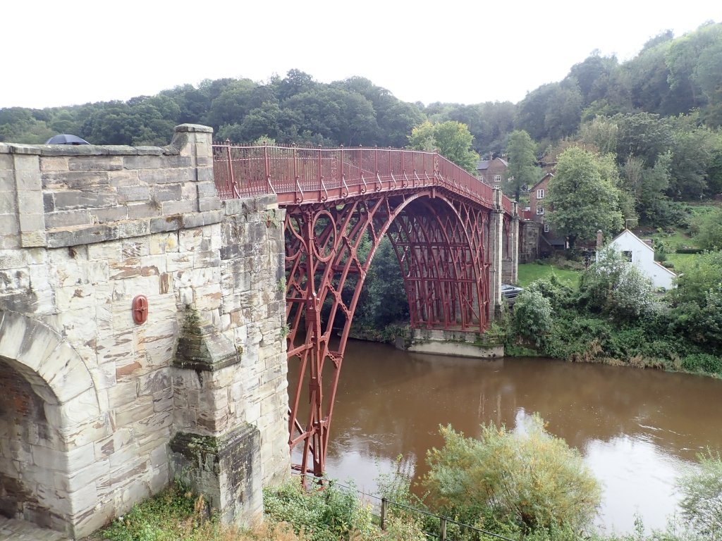 We had a rather itchy start to the day – the room seemed pristinely clean, but we definitely got seriously bitten by something during the night! We quickly rejoined the NCN route and followed a series of small country lanes through small villages. We stopped for coffee in a pleasant park in Shawbury – notable as the home to the lowest ever recorded temperature in England of -25C in December 1981. Today was pleasantly mild however, for early October anyway, and the predicted showers failed to materialise. The country lanes got narrower, twistier and hillier as we got closer to the end, but the scenery was lovely, particularly passing “The Wrekin” hill. We finished with a long downhill through Coalbrookdale – claim to fame, the location of the first ever iron ore smelting – down to the River Severn. At this point, the good weather deserted us – we were barely 2km from the end and the rain hammered down, so we arrived soaked. The road through Ironbridge was closed for resurfacing which was slightly worrying, but we were able to get through on the pavement to the pub that we were staying in tonight. We checked in and then went for a wander around town. Ironbridge is a very picturesque little town that looks like the sort of place that is crazy touristy in summer, but at this time of year was nearly deserted. We had a fine dinner of Sausage, chips and gravy from “The Ironbridge” chippy back in our rather chilly room – staring at radiators and wondering when (if ever) they would come on would become something of a theme for this trip!