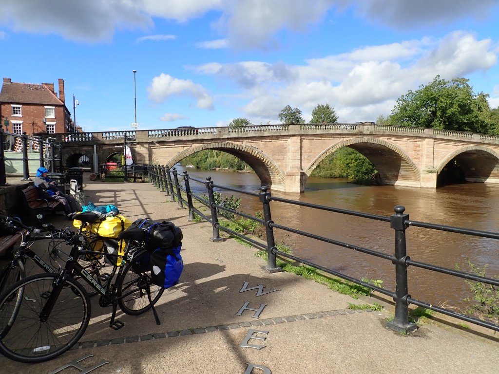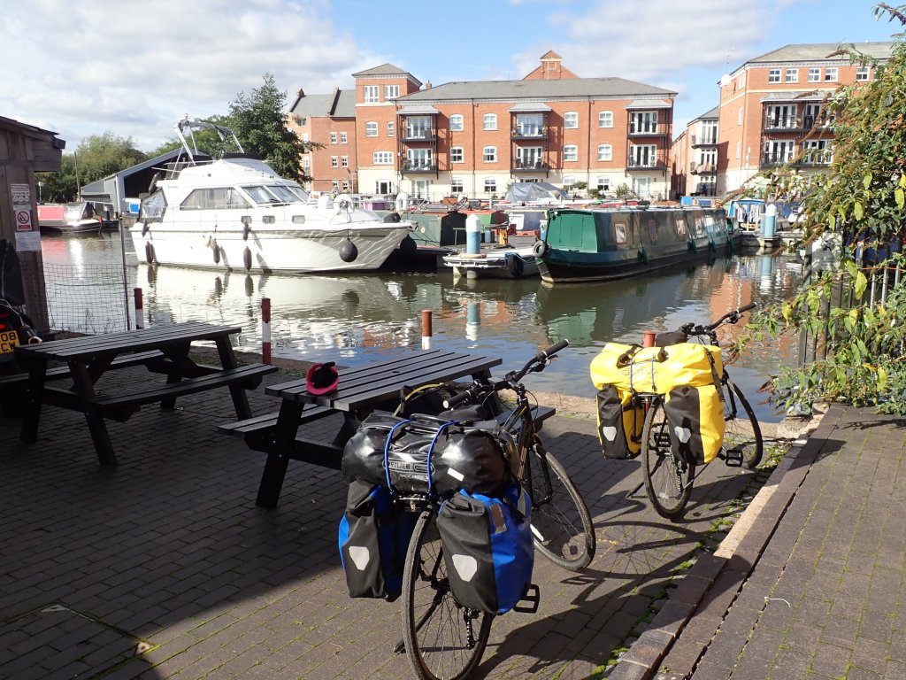 We started the day with a “free” breakfast – well, it was included in the cost of the room – although we had to walk a short distance down the road to get it at the pub next door. Even so, the choice of a full breakfast menu made last night’s £50 room great value. The route took us over the Ironbridge and then on a traffic free trail along the River Severn. Passing the village of Coalport, we came to a sign announcing that the “permissive” route ahead through a private estate was closed – we did the only reasonable thing under the circumstances and ignored the sign, which turned out to be a good decision as we got through with no problems and arrived in the town of Bridgnorth. Here, we called into Clee Cycles – after 3 days cycling, I realised that the cheap bikes that we had bought for this trip didn’t have quick-release wheels and we didn’t have a spanner – the spare inner tubes that we were carrying wouldn’t be a whole lot of use without that. They didn’t have one in stock to sell us, but very generously gave us a free one that they had going spare – great work Clee Cycles, much appreciated! Leaving Bridgnorth, NCN45 became rediculously convoluted (as NCN routes always seem to do) so we made the decision to abandon the route and follow the B4363 road to the next town of Bewdley. Here the morning of showery rain finally gave way to sunshine and we had a coffee overlooking the River Severn in this pretty little town. From here it was a short ride to tonight’s accomodation in Stourport. When we arrived, the room wasn’t quite ready, but the sun was shining and there was a lovely beer garden overlooking the River Severn, so it seemed rude not to have a beer. When we did get checked in, they agreed to put our bikes safely in the yard at the back for the night, so we decided to go back outside and have a few more beers!
